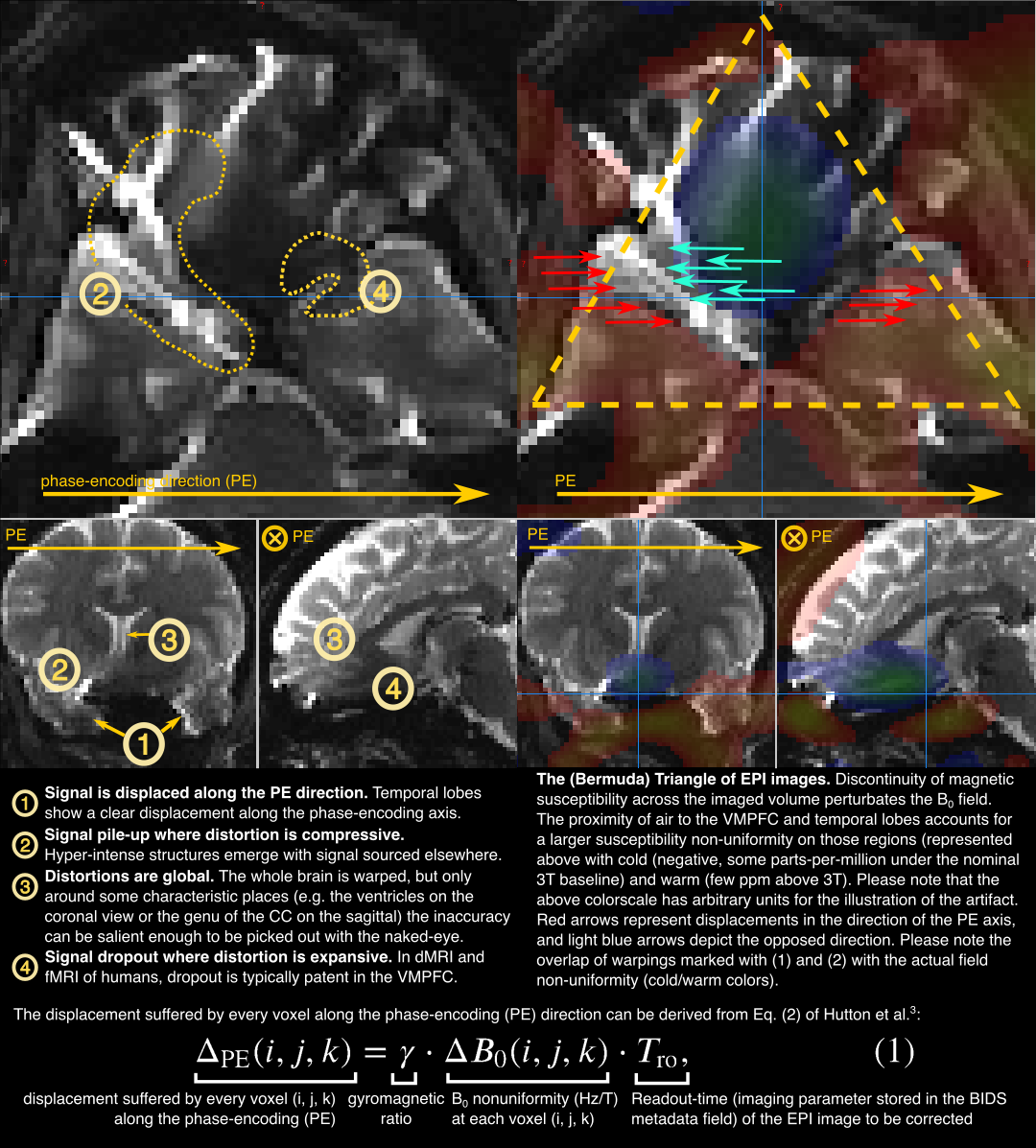 Many studies acquired (especially with legacy MRI protocols) do not have any information to estimate susceptibility-derived distortions. In the absence of data with the specific purpose of estimating the \(B_0\) inhomogeneity map, researchers resort to nonlinear registration to an «anatomically correct» map of the same individual (normally acquired with T1w, or T2w sequences). One of the most prominent proposals of this approach is found in [Studholme2000].