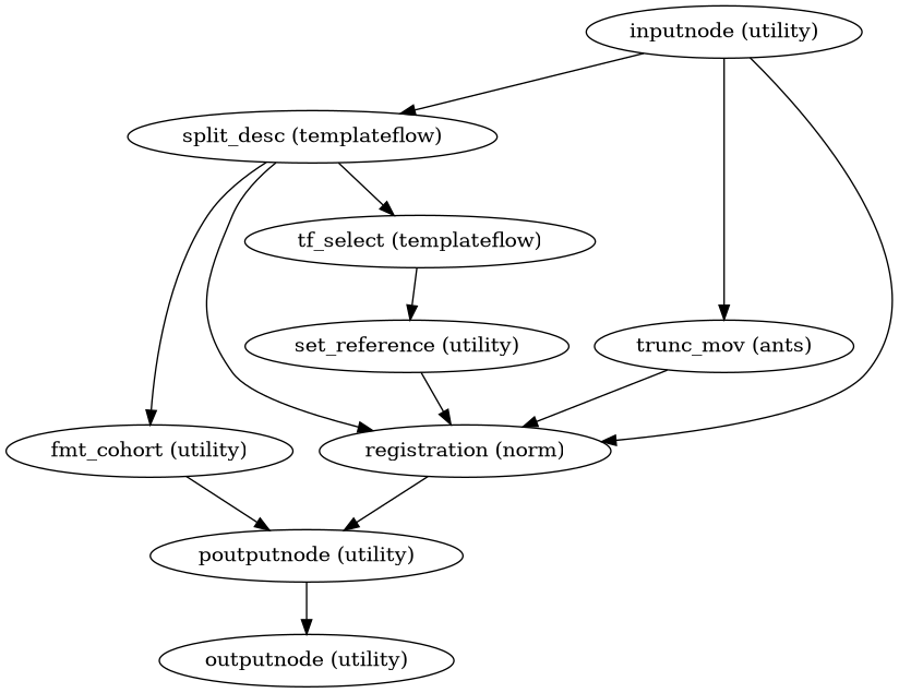 This workflow defines an iterable input over the input parameter templates, so Nipype will produce one copy of the downstream workflows which connect poutputnode.template or poutputnode.template_spec to their inputs (poutputnode stands for parametric output node). Nipype refers to this expansion of the graph as parameterized execution. If a joint list of values is required (and thus cutting off parameterization), please use the equivalent outputs of outputnode (which joins all the parameterized execution paths).